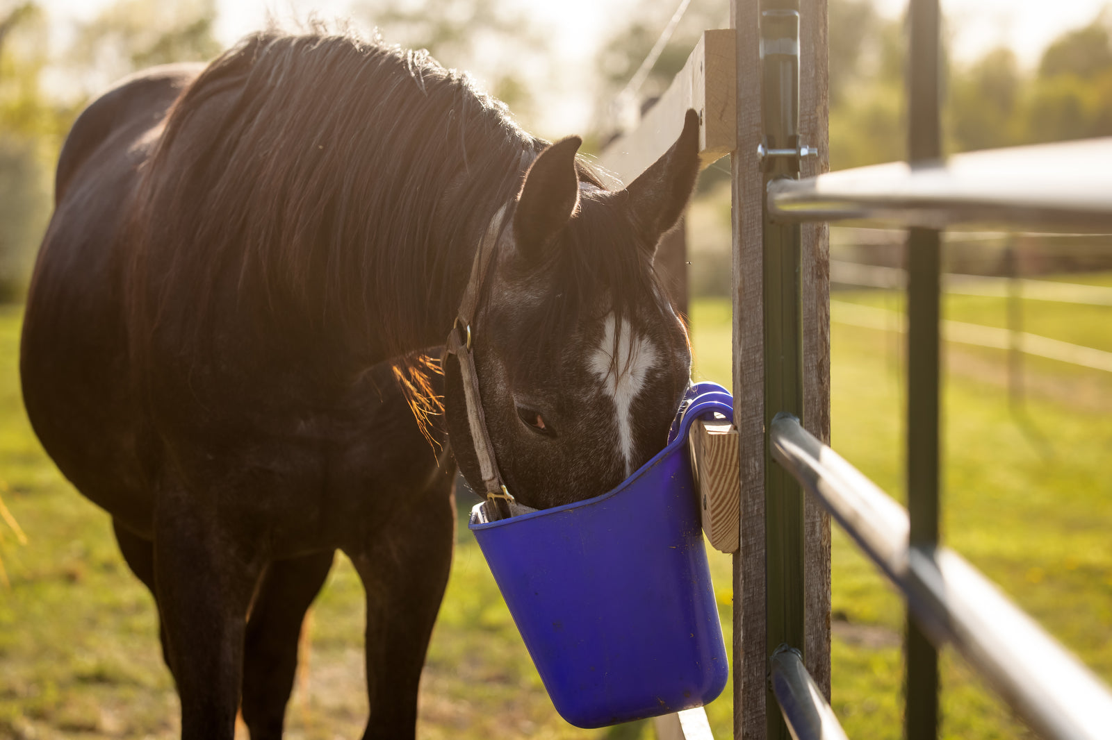 For horses on pasture, you may need to limit pasture access as well, but again, never restrict forage completely with dry lotting, as this can lead to digestive problems as well as stable vices such as wood chewing. One option is using a grazing muzzle during turnout which reduces the amount of grass your horse is able to consume.
