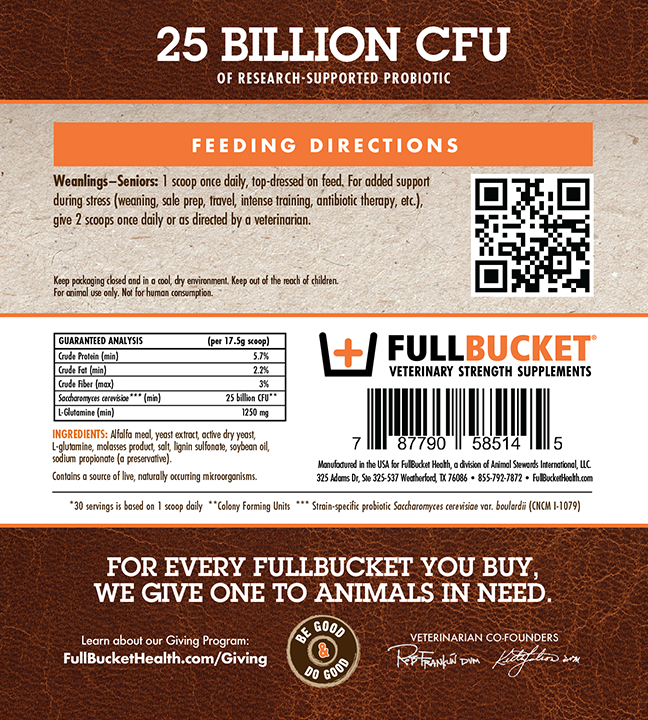 FullBucket Equine Probiotic Pellets are a yeast-based formula naturally supports gut health and optimal immune function. With probiotic, probiotics & L-Glutamine.